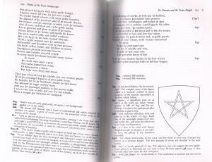 To be fair though, there is one unambiguously positive female in SGGK. And her name is Mary. And she is associated with the pentagram, which, as all readers of The Da Vinci Code know, represents Venus and the sacred feminine. Gawain bears a pentangle on his shield. He wears the pentangle because, as an endless knot, it represents the perfection he aspires to as a knight. The five points also have symbolic significance. Gawain is said to be faultless in his five senses; he never fails with his five fingers; he puts his trust in the five wounds of Christ; in battle, he receives strength from contemplating the five joys that the Virgin Mary had in her son; he has five virtues (generosity, fellowship, purity, courtesy and pity). He is so devoted to the Virgin Mary that he has her picture painted on the inside of his shield (ll. 619-670).