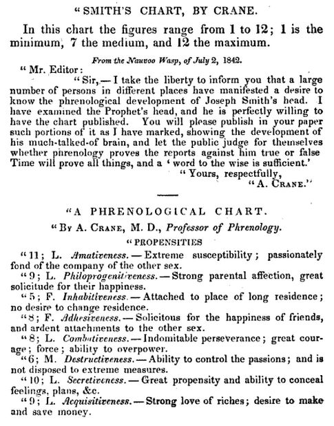 “Sir, I take the liberty to inform you that a large number of persons in different places have manifested a desire to know the phrenological development of Joseph Smith’s head. I have examined the Prophet’s head, and he is perfectly willing to have the chart published. You will please publish in your paper such portions of it as I have marked, showing the development of his much-talked-of brain, and let the public judge for themselves whether phrenology proves the reports against him true or false[.] Time will prove all things, and word to the wise is sufficient.”