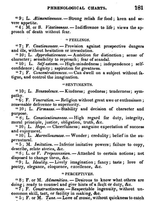 Twain also recounts a visit to a London phrenologist, once under a fake identity, and then again several months later under his own nomme de plume. He found that the two readings in no way matched, and that the second one was clearly far more specifically tailored to his public persona. I will include a detailed phrenological reading of Mark Twain that found–surprise, surprise–that he was very funny indeed.
