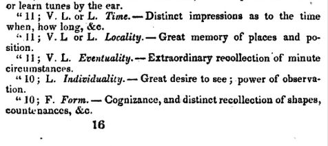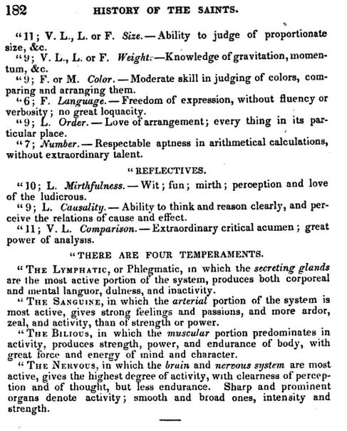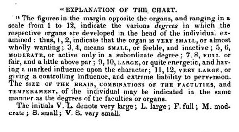 The scores range from 1-12, twelve meaning that the part of the brain in question is very large. It turns out, according to Dr. Crane, Smith was extremely susceptible to and desirous of the opposite sex. A lot. Like 11 out of 12 a lot. Also, he was judged to have an enlarged region of critical acumen. He scored low on “attachment to places of long residence,” musical aptitude, destructiveness, indifference to life, and, interestingly, the sentiment of “veneration,” which is described as “religion without great awe or enthusiasm” and “reasonable deference to superiority.”