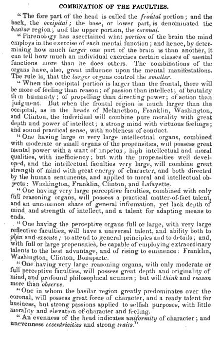 Sifting through these articles, I was struck by the impact that phrenology managed to have on American culture. Phrenology came out of the work of German doctor Franz Joseph Gall in the first two decades of the 19th century, and was popularized in the United States in the 1830s by a well-known physician named Charles Cardwell. I was surprised to learn from Robert E. Reigel, writing in the 1930s, that the earliest phrenologists were respectable physicians who had derived their theories by employing the empirical tools of observation and measurement to the psyche, even if the conclusions were uniformly unrevealing. The thought behind phrenology seems to have followed as such: that the brain consisted of modular faculties that were generally independent and localized, an observation that would have been supported through observations of traumatic injuries like the one received by Phineas Gage in 1848, whose personality changed radically when his left frontal lobe was largely destroyed by a railroad spike. It seemed not implausible that if mind and brain were deeply intertwined that the size of these various organs in the skull might determine one’s personality. And if the shape of the brain determined the shape of the skull, well, could one not possibly infer the personality traits of the individual from an examination of the contours of the head? Sure there are a lot of speculative leaps in there, but it’s not impossible. It could have been right. It just happened to not be, and quite quickly the interpretive flaws that doomed phrenology were recognized.